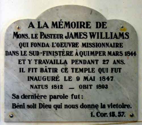 Pierre commémorative du travail de James Williams missionnaire méthodiste Gallois dans le sud-Finistère.